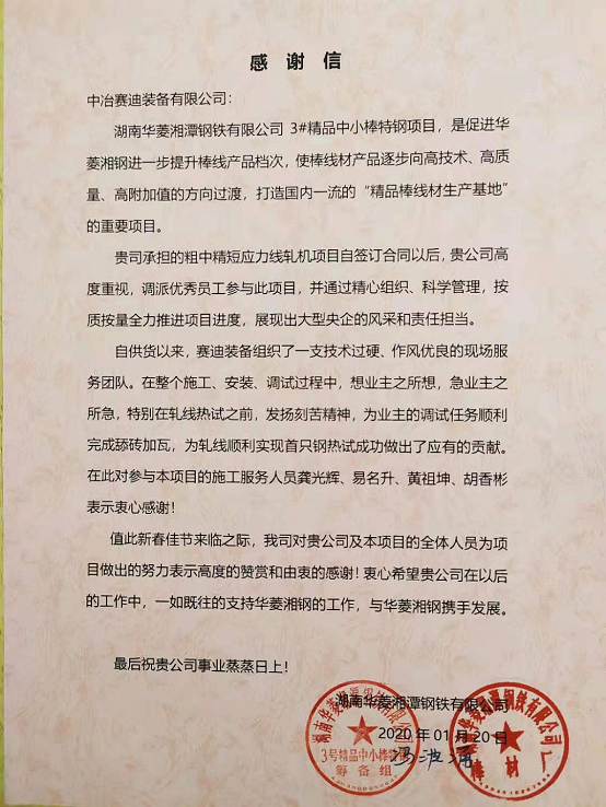 此項目從簽訂合同以來,賽迪裝備積極應(yīng)對,精心組織,全力配合業(yè)主現(xiàn)場生產(chǎn)計劃,截止到2019年12月26日,該項目在線和備件共42臺套軋機(jī)全部運(yùn)抵現(xiàn)場,陸續(xù)安裝、調(diào)試并一次性熱試成功,最終受到業(yè)主的好評,并專程發(fā)來了感謝信。