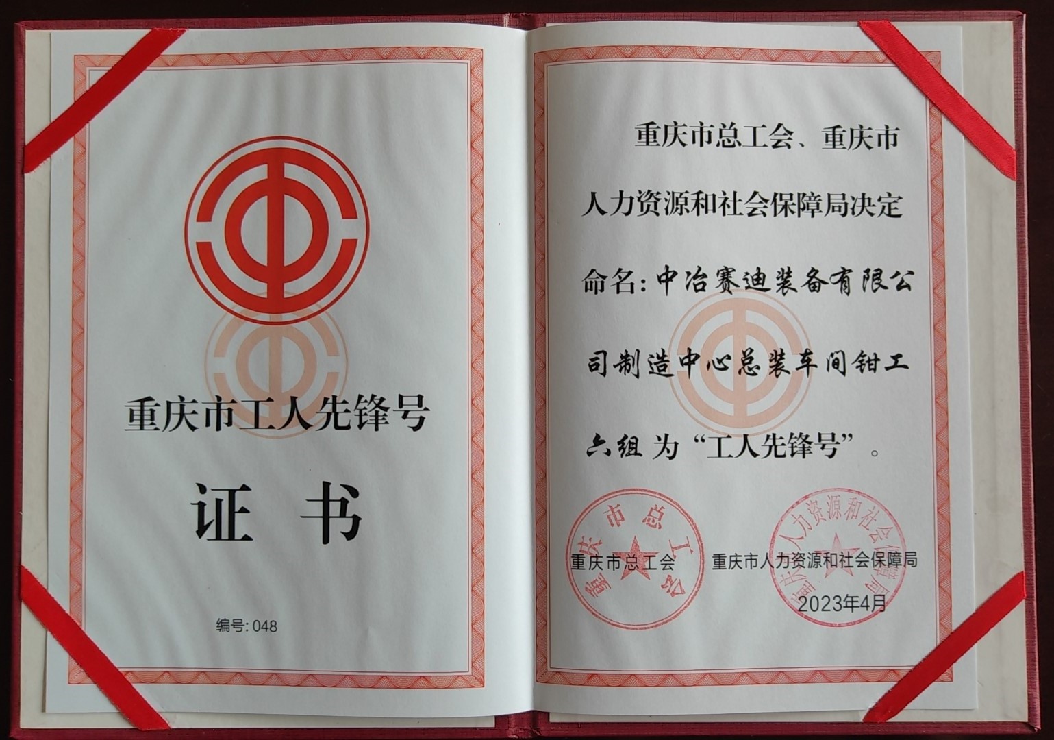 2023年4月27日,在“五一”國際勞動節即將到來之際,裝備公司制造中心總裝車間鉗工六組榮獲重慶市總工會、重慶市人力資源和社會保障局共同授予的2023年重慶市“工人先鋒號”。