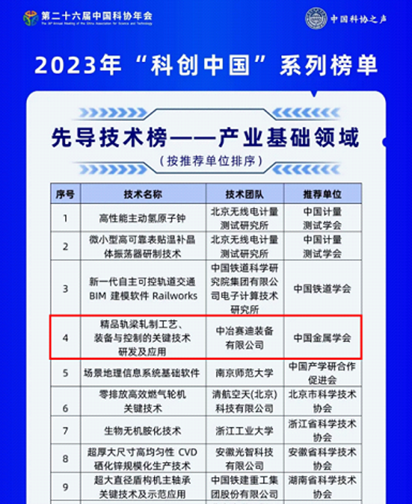 7月2日,中國(guó)科學(xué)技術(shù)協(xié)會(huì)正式發(fā)布2023年“科創(chuàng)中國(guó)”系列榜單,中冶賽迪“精品軌梁軋制工藝裝備與控制關(guān)鍵技術(shù)”上榜產(chǎn)業(yè)基礎(chǔ)領(lǐng)域先導(dǎo)技術(shù)榜單。